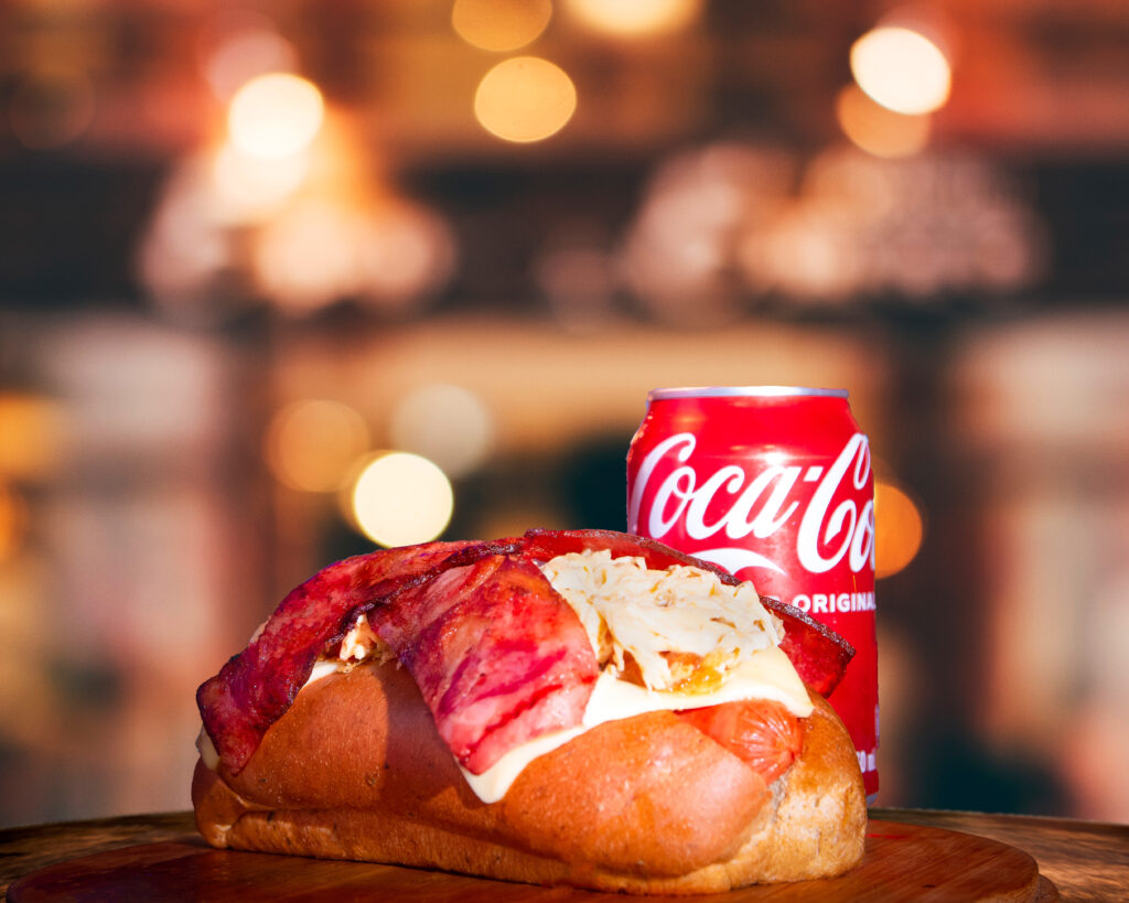 Pan brioche, dip Bekon, Salchicha americana, extra tocineta, pollo, piña, queso, papitas trituradas.